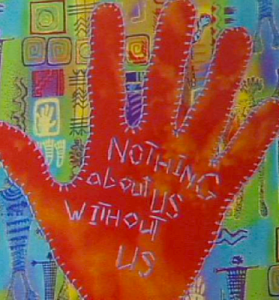 1. Freewrite: At the start of the lesson, the statement “Nothing About Us Without Us” is written up on the board. Ask students to take five minutes and write a freewrite response to this quote: What does this phrase mean to you? What is it trying to say? How would you describe or define this statement in your own words? (5 mins)